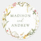 Élégant autocollant de mariage fleur sauvage avec vos noms affichés en lettres vertes entourés d'une couronne de feuillage vert et de fleurs dans les tons jaune doré, rose et violet. Les autocollants de fleur sauvage d'aquarelle sont parfaits pour les mariages du printemps et de l'été.