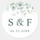 Cet autocollant monogramme mariage est composé d'eucalyptus à l'aquarelle peinte, de feuilles vert botanique et bleu clair.