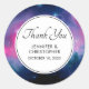 Mariage merci autocollants avec une belle conception abstraite en rose et bleu. Des étoiles blanches parsemèrent cette image du cosmos. Trippy et cool. Un cercle blanc avec une bordure noire superposée avec votre texte à l'intérieur.