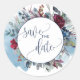 Magnifique Sauvons la Date enveloppe sceau, avec une calligraphie manuscrite moderne "Save the Date" phrase encastrée par un magnifique bouquet floral aquarelle avec des fleurs et du feuillage dans des teintes bleu roux, bleu marine, bordeaux, violet et magenta avec une délicieuse tache d'aquarelle bleue derrière. Une partie de notre collection "Fleurs célestes" avec une variété de produits de coordination disponibles.