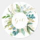 Ces enveloppes mariage or et vert eucalyptus sont parfaites pour un mariage simple. Le design se compose de feuilles et de fleurs peints à la main en aquarelle vert, or et bleu, soigneusement arrangés en bouquets et cadres géométriques élégants. Personnalisez les étiquettes avec les initiales de la mariée et du marié.