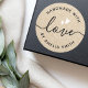 Autocollants ronds avec des cœurs blancs, le texte "fabriqué avec amour" et votre nom personnalisé sur une image imprimée avec un fond aspect papier kraft. Le mot "amour" est écrit dans une police de caractères calligraphiée élégante. Utilisez comme sceaux d'enveloppe, autocollants pour cadeaux et faveurs, emballage de produits, etc. Suivez-nous sur Facebook : @businessstationery pour plus de produits, d'actualités, de ventes et plus encore.