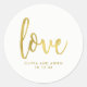Élégant autocollant de mariage avec l'amour de la typographie fausse or moderne dressé contre un arrière - plan blanc.