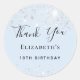 Un autocollant pour une fête d'anniversaire du 10e anniversaire (ou de n'importe quel âge). Un arrière - plan bleu clair, bleu bébé avec de la poussière de parties scintillant fausse argent. Le texte : Merci est écrit avec un grand script de style à la main moderne. Personnalisez et ajoutez un nom et un âge.