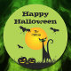 Les chauves-souris dans le ciel volent au-dessus d'un chat noir aux yeux verts et levent une lanterne sur ces autocollants de fête d'Halloween. CORRESPONDRE des articles dans notre magasin.