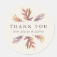 Conçu pour coordonner avec la collection Lea Delaveris Design automne feuilles de répétition dîner, cet autocollant rond est une touche parfaite pour dire merci à vos invités. Avec son aquarelle vive feuilles d'automne, ce design fonctionne aussi bien pour un dîner mariage d'automne ou Thanksgiving. Le texte de remerciement et les noms sont modifiables pour tout message que vous souhaitez inclure.
