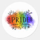 Cette oeuvre colorée présente le mot Pride sur une aquarelle douce.