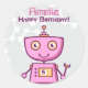 L'autocollant d'anniversaire du robot rose mignon comprend du texte personnalisé et un jeu de couleurs rose, violet, orange et gris.