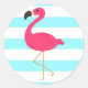 Sticker Rond Flamant rose rose sur rayures Turquoises claires