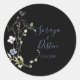 Cet autocollant rond à mariage floral sauvage est parfait pour une réception de mariage rustique. Ce design présente une aquarelle peinte à la main, des fleurs de forêt sauvage blanches et bleues avec un feuillage vert dans un arrière - plan noir.