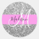 Glam et girly rose et gris / argent parties scintillant scintillent le nom de monogramme blanc et l'autocollant rond classique initial. Votre nom personnalisé et votre monogramme sont écrits dans un élégant script écrit à la main avec un arrière - plan rose. Vous pouvez modifier la couleur du texte, le style et la taille de police à l'aide de l'option personnaliser.