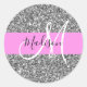 Glam et girly rose et gris / argent parties scintillant scintillent le nom de monogramme blanc et l'autocollant rond classique initial. Votre nom personnalisé et votre monogramme sont écrits dans un élégant script écrit à la main avec un arrière - plan rose. Vous pouvez modifier la couleur du texte, le style et la taille de police à l'aide de l'option personnaliser. Un cadeau d'anniversaire ou de Noël parfait !