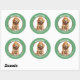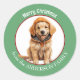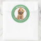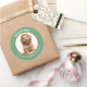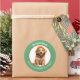 L'image d'un adorable chien de chiot Golden Retriever portant un casquette d'hiver est au centre de cet autocollant Holiday. L'image est encadrée dans une bordure circulaire verte qui contient votre texte personnalisé en blanc. Idéal pour les cartes de Noël, la correspondance et les forfaits cadeaux.