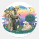 Saint François, patron des animaux et personnages aimés qui croisent des lignes confessionnelles, est représenté ici avec une Grande Pyrénées. La figure de Saint François elle-même a été adaptée du chef-d'oeuvre de Giotto du XIVe siècle et un nouvel arrière - plan a été créé par Jean Fitzgerald
