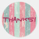 Un autocollant qui dit merci ! dans une police cool funky. L'arrière - plan est une texture rose et vert rustique en bois de palissandre grunge.
