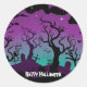 Design autocollant d'Halloween noir, violet, turquoise, avec un cimetière avec des arbres éffrayants, des tombes, des croix, des crânes, une chouette, des chauves-souris, des fantômes et des nuages sur le violet et arrière - plan turquoise.