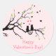 Un autocollant romantique rose pâle de la Saint-Valentin avec une silhouette noire de deux chats amoureux assis sur une branche. Leurs queues sont entrelacées en forme de coeur. Des silhouettes noires d'oiseaux, de feuilles verts et de trois coeurs roses au-dessus des chats complètent le design.Le texte "Heureuse Sainte-Valentin" est mis en rose correspondant sous l'image. En utilisant les outils de modification à l'écran, vous pouvez modifier le texte, la police, la couleur de police et la taille de police pour créer votre propre conception unique.