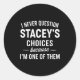 Sticker Rond I Never Question Stacey's Choices Because I'm One