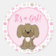 Ce baby shower autocollant design pour les filles dispose d'un mignon chiot brun avec des pois roses et bruns.
