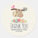 autocollants d'évènement Merci avec l'illustration d'un mignon paresseux brun accroché à l'envers. Ce drôle de petit gars se tient sur une branche qui a un petit oiseau rose d'un côté de la branche et un bouquet de roses à la façon d'un doodle de l'autre côté. En-dessous se trouve un arrangement de fleurs colorées dessinées à la main. Cette paresse adorable a aussi des joues roses et 3 coeurs mignons sur son cul. L'arrière - plan a un motif rayé jaune clair ondulé.