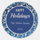 Laissez le texte ou modifiez-le pour ajouter votre touche unique. Ces autocollants Happy Holidays présentent des feuilles damassés blancs sur un arrière - plan bleu.