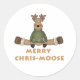 Un orignal en bottes de randonnée et un pull vert et le texte qui dit "Joyeux Chris-Moose" est présenté sur ces cartes de voeux, boutons, magnets, sacs fourre-tout, T-shirts et plus.