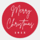 Joyeux autocollants de Noël avec le texte "Joyeux Noël" dans une police manuscrite de style script sur un arrière - plan rouge avec le texte de l'année ou personnalisé ci-dessous.