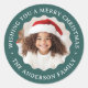 Des autocollants ronds et verts de pin avec le texte personnalisable "Je vous souhaite un joyeux Noël" et votre nom autour de votre photo à l'intérieur d'une bordure ondulée.