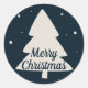 Cet autocollant rond moderne présente une silhouette de pin blanc avec de petits flocons blancs sur un arrière - plan bleu plat. Les mots personnalisables "Joyeux Noël" sont écrits dans une police bleue élégante
