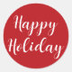 Simple autocollant rouge avec un script blanc audacieux Happy Holiday. Un accessoire parfait pour un cadeau élégant ou un emballage de produit avec une sensation de Noël vintage.