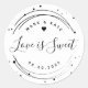 Autocollants / étiquettes de mariage personnalisés avec lignes circulaires élégantes et design "L'amour est doux". Personnalisez avec le nom du marié et du marié/couple et la date du mariage. Appliquez sur des bonbons mariages ou des gâteaux de faveur sucrés, des boîtes, des enveloppes et plus encore!