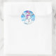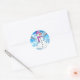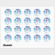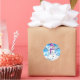 aquarelle colorée et dessin à l'encre d'un bonhomme de neige avec casquette violet et écharpe debout sur un champ couvert de neige sous un ciel bleu nuageux sur un autocollant