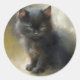 Ajoutez ces stickers de chaton sucrés à votre courrier et faites sourire le destinataire ! Ce tableau présente un adorable chaton noir à la fourrure molle et moelleuse. Elle est assise dans une pose sereine, comme pour calculer son prochain déplacement. Ses yeux verts brillent de curiosité alors qu'elle étudie son environnement. L'arrière - plan de la peinture est un gris doux et muet mélangé au jaune/vert, ce qui aide à mettre en valeur son manteau foncé. L'ensemble est un effet d'innocence, de jeu et de charme, ce qui en fait un doux ajout à n'importe quelle pièce.
