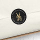 Étiquette votre correspondance ou vos produits avec ces autocollants chic qui correspondent à notre suite de marque du logo des ciseaux floraux pour coiffeurs et salons. Les autocollants noirs riches présentent au centre une illustration de ciseaux de feuille d'or faux, avec deux champs de texte courbant autour de l'extérieur, en lettres blanches classiques.