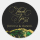 Magnifique et luxueux, abstrait mariage d'encre d'alcool merci autocollants. Luxe vert émeraude, noir et or avec une police de script chic. Modifiez facilement le modèle aux noms de la mariée et du marié. Art original réalisé à l'encre d'alcool par l'artiste internationale Pauline Benjes. Sticker de luxe Emerald Green Gold Custom Classic Round Sticker.