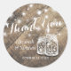 Mariage Favor Merci Sticker Modèle - Elegant Mason Jar et String Lights sur Arrière - plan en bois rustique. Un design parfait pour votre grand jour. Tous les styles de texte, couleurs, tailles peuvent être modifiés selon vos besoins !