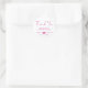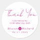 Script de Magenta rose calligraphie Merci mariage mariage rond autocollant. Un design élégant avec l'expression "Merci" dans la calligraphie de script rose fuchsia et vos noms.