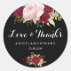 Cet autocollant classique tropical noir amour & merci mariage classique rond est parfait pour un mariage rustique. Le design artistique bordo marsala présente des roses d'aquarelle, verts, roses, bordeaux et roux assortis de verdure bien disposés dans un bouquet de fleurs gracieux et radieux.