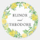 Belle couronne fleurie jaune présente des fleurs roses et mimosa nichées dans des feuilles et feuillage verts à la sauge ouverte et aérée. Parfait pour votre mariage de printemps ou d'été. Vos noms sont écrits dans une police serif classique et simple. Très facile à customiser. Ajout parfait à vos sacs de faveur de mariage ou boîtes à gâteau mariage.