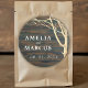 Sticker Mariage Rustique Dar Wood Winter Tree White Script. Nom de la mariée et du marié et date du mariage en écriture blanche sur arrière - plan en bois rustique avec un arbre d'hiver avec des flocons de neige blancs. Cliquez sur le lien de collection ci-dessous pour obtenir plus d'éléments correspondants.