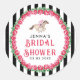 Cette assiette de fête Derby présente un cheval de course aquarellé avec un jockey en rose entouré d'une couronne de roses rouges avec la mention "Bridal Shower". Il y a un fond rayé noir et blanc. Vous pouvez la personnaliser avec un nom et une date.