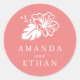 Les autocollants chic et personnalisés de l'île sont conçus pour correspondre à notre collection de faire-part de mariage de l'île Hibiscus, avec les noms du couple en lettres blanches élégantes avec une fleur d'hibiscus tropicale sur un arrière - plan corallien estival vibrant.