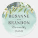 Élégants autocollants de mariage avec un lavage à l'aquarelle vert/bleu, des feuilles d'eucalyptus botaniques enchanteurs, des éclaboussures de fausse feuille d'or, le nom du couple et la date du mariage.