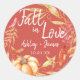 Les autocollants de faveur de mariage sur le thème "Tombez amoureux" présentent un feuillage automnal orange et doré, une citrouille aquarelle automnale et un monogramme personnalisable burgundy avec les noms des mariés et la date du mariage sur un fond rouge feuille d'automne. Conçu exclusivement pour vous par Happy Dolphin Studio. Si vous avez besoin d'aide ou de produits assortis, veuillez nous contacter à happydolphinstudio@outlook.com. Nous sommes ravis de vous aider à rendre votre mariage le plus beau jour !