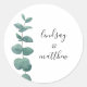 Cet autocollant mariage minimal est doté d'eucalyptus aquarelle et d'une typographie élégante. Facile à personnaliser. Aquarelle originale © Michele Davies.