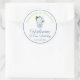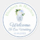 autocollants de Merci pour tout événement (montré ici pour un autocollant de bienvenue mariage mais tous les champs de texte sont personnalisables). Le design se compose d'un élégant vase en pot de gingembre rempli de fleurs de printemps dans les tons bleu et blanc. Ce design fonctionnerait bien si vous mettez en place des sacs de bienvenue mariages ou des paquets de bienvenue et que vous voulez que tout ressemble à lié / coordonné.