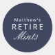 Un jeu amusant sur les mots fête faveur autocollant pour une fête de retraite, ce design est utilisé sur les bonbons emballés menthe. Le modèle de texte comprend le nom de l'invité d'honneur et les mots "Retire Mints". Une idée mignonne et ironique pour les faveurs amusantes de la fête lors de votre fête, vous pouvez mettre les autocollants sur de petites boîtes à menthe, ou faire votre propre en achetant vos bonbons à la menthe choisis et les portionner dans de petits sacs à sucreries de cellophane, puis en apposant l'autocollant sur l'extérieur d'eux. Ces autocollants sont disponibles en bleu marine, noir ou blanc. Montrées ici dans la plus petite taille de 1 1/2 pouce de diamètre, elles sont également disponibles dans une plus grande taille de 3 pouces de diamètre.