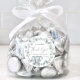 Un sticker mignon pour votre baby shower, des cartes de remerciement et des faveurs de fête avec "Un petit Merci doux" dans un mélange de typographie simple et un script élégant avec un swash du coeur et une aquarelle d'un bébé éléphant vert menthe sur une couronne de vert sauge eucalyptus verdure.