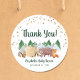 Des autocollants mignons pour votre correspondance de baby shower et des faveurs de fête avec une illustration aquarelle des animaux des bois avec leur tente campant dans les montagnes et la forêt, une superposition d'étoiles dorées, et "Merci !" et le nom de la future mère dans un script vert de forêt.