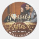 Célébrez la saison des fêtes magiques et festives avec notre autocollant photo de Noël personnalisé Mr & Mrs. Notre design de vacances moderne mariage moderne présente un message de typographie "Merrily Ever After" dans une écriture manuscrite style script avec le feuillage festif de vacances pour créer ce design typographique magnifique et élégant. L'autocollant de vacances est conçu dans une seule mise en page photo avec la joyeuse toujours après affiché en faux or sur le grand espace réservé photo. Une texture rustique de grain de bois placée le long du fond avec "M. & Mme" s'affiche avec le nom de famille. Toutes les illustrations contenues dans ce joyeusement jamais après l'autocollant photo de vacances en bois vintage sont dessinées à la main par Moodthology. Vous pouvez customiser la taille du texte, la couleur du texte, la police et la mise en page de votre propre préférence de conception personnelle